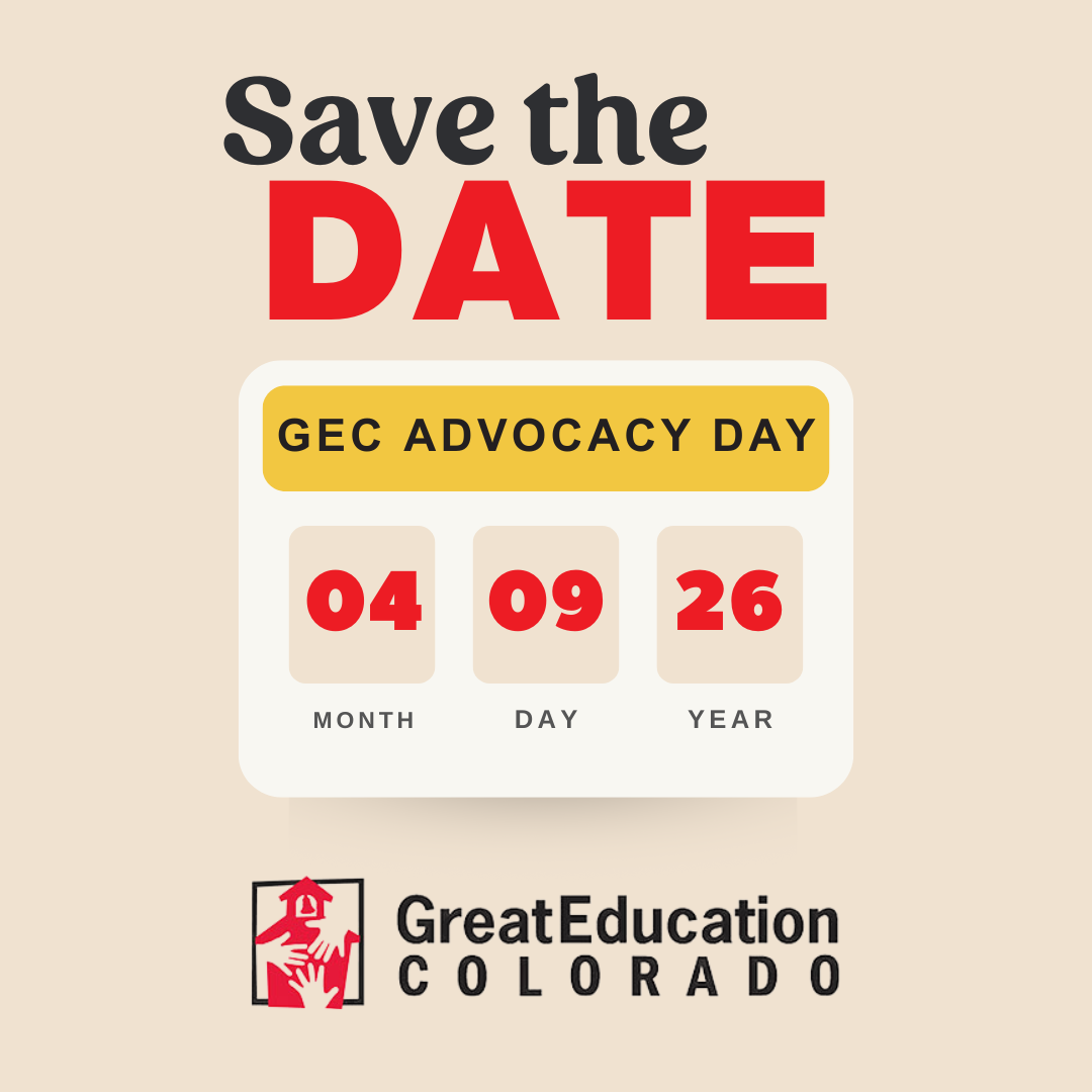 First Baptist Church of Denver 1373 N Grant Street, Denver, CO, United StatesJoin Great Education Colorado for a day of advocacy, skill-building, and community! Thursday, April 9 from 8:30 am to 3:00 pm @ First Baptist Church of Denver (1373 N Grant St) Our 2026 Advocacy Day is an exciting opportunity to level up your support of public education. Whether you're a seasoned advocate or a…